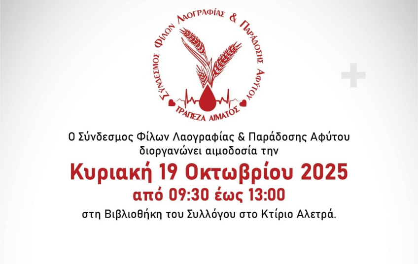 Ο Σύνδεσμος Φίλων Λαογραφίας και Παράδοσης Αφύτου διοργανώνει εθελοντική αιμοδοσία την Κυριακή 19 Οκτωβρίου 2025, από τις 09:30 το πρωί έως τη 1:00 το μεσημέρι, στη Βιβλιοθήκη του Συλλόγου, στο Κτίριο Αλετρά.