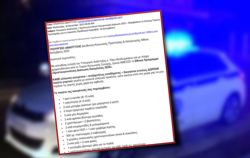 Ακόμη ένα παραπλανητικό e-mail εντοπίστηκε να διακινείται τις τελευταίες μέρες, αυτή τη φορά έχοντας τη μορφή δήθεν κρατικού προγράμματος που υπόσχεται δωρεάν γιορτινό πακέτο από το Υπουργείο Ανάπτυξης με τον τίτλο «Χριστουγεννιάτικη Διάσωση Οικογένειας 2025».
