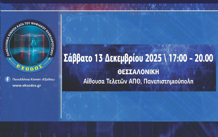 Μια ιδιαίτερα επίκαιρη και πολυσυζητημένη εκδήλωση με τίτλο «Πριν είναι αργά: Υπερασπιζόμαστε την ελευθερία στην ψηφιακή εποχή» διοργανώνει η Πανελλήνια Κίνηση κατά του Ψηφιακού Ολοκληρωτισμού “Έξοδος”, το Σάββατο 13 Δεκεμβρίου 2025, από τις 17:00 έως τις 20:00, στην Αίθουσα Τελετών του ΑΠΘ, στην Πανεπιστημιούπολη Θεσσαλονίκης. Συμπαραστάτης στη διοργάνωση είναι η Εστία Πατερικών Μελετών.