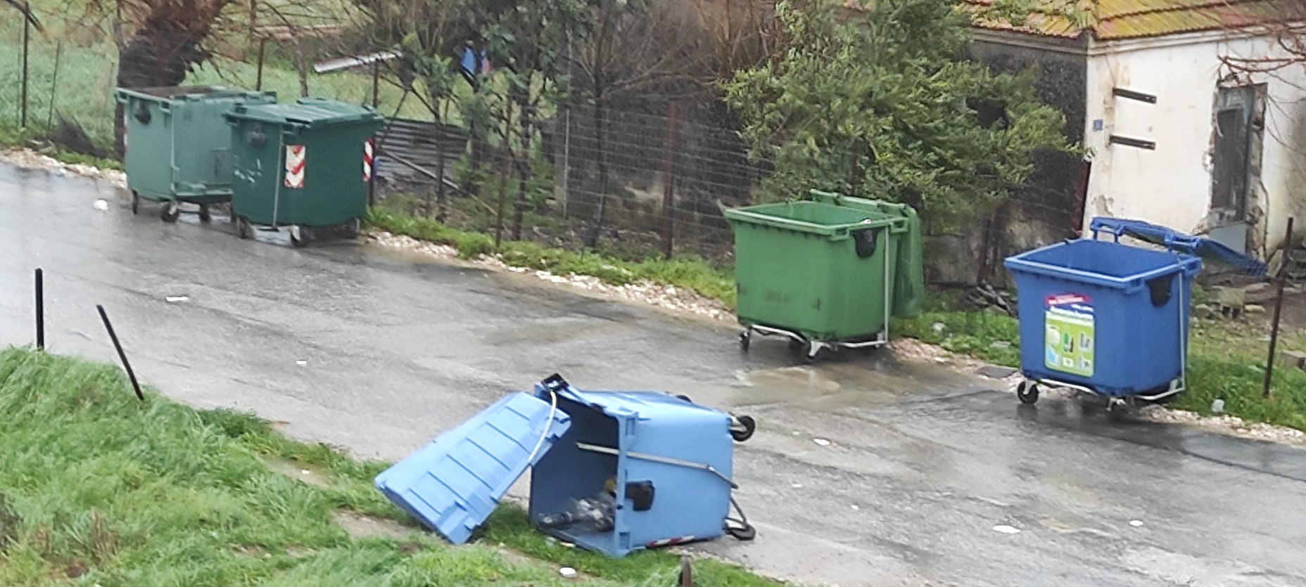 Κάδοι έχουν παρασυρθεί από τους ανέμους με αποτέλεσμα να αποτελούν παγίδες για όσους κυκλοφορούν.