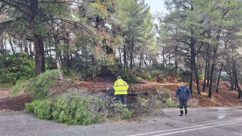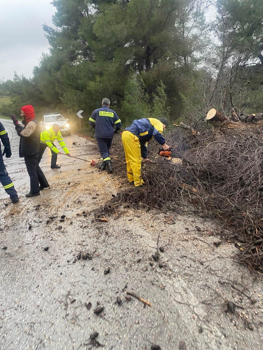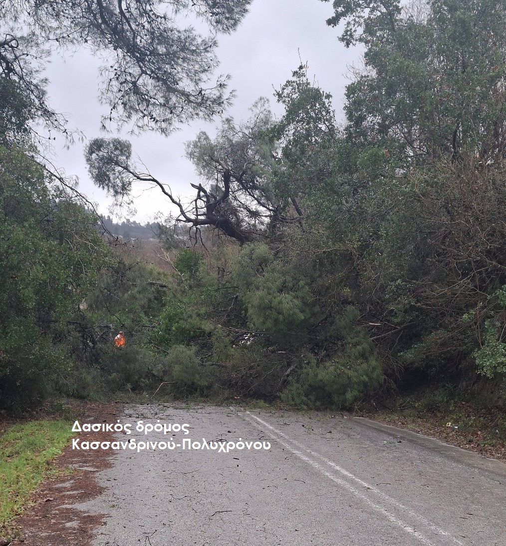Στην επαρχιακή οδό Σιθωνίας οι ισχυροί άνεμοι έχουν ξεριζώσει πεύκα. Ένα δέντρο έπεσε μεταξύ Νικητής και Μεταμόρφωσης και ένα μεταξύ Μεταμόρφωσης - Βατοπεδίου. Στο σημείο βρίσκονται μέλη της ομάδας Δασοπροστασίας Μεταμόρφωσης.