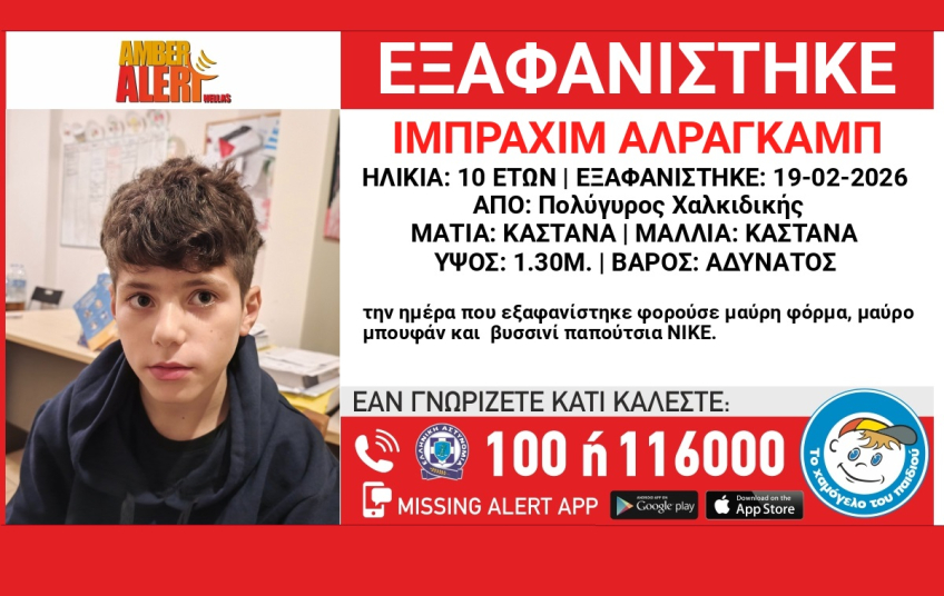 Στις 19/2/26, και ώρα 08:00, εξαφανίστηκε από χώρο φιλοξενίας ασυνόδευτων ανηλίκων, στον Πολύγυρο Χαλκιδικής, ο Ibrahim Alragab 10 ετών, με καταγωγή από Συρία .«Το Χαμόγελο του Παιδιού» ενημερώθηκε για την εξαφάνιση του ανήλικου Ibrahim Alragab, στις 19/2/26 και προχώρησε στην ενεργοποίηση του μηχανισμού AMBER ALERT HELLAS, κατόπιν εισαγγελικής εντολής. Ο Ibrahim Alragab, έχει καστανά μαλλιά, καστανά μάτια, ύψος 1,30 και είναι αδύνατος. Την ημέρα που εξαφανίστηκε φορούσε μαύρη φόρμα, μαύρο μπουφάν και βυσσινί παπούτσια NIKE.