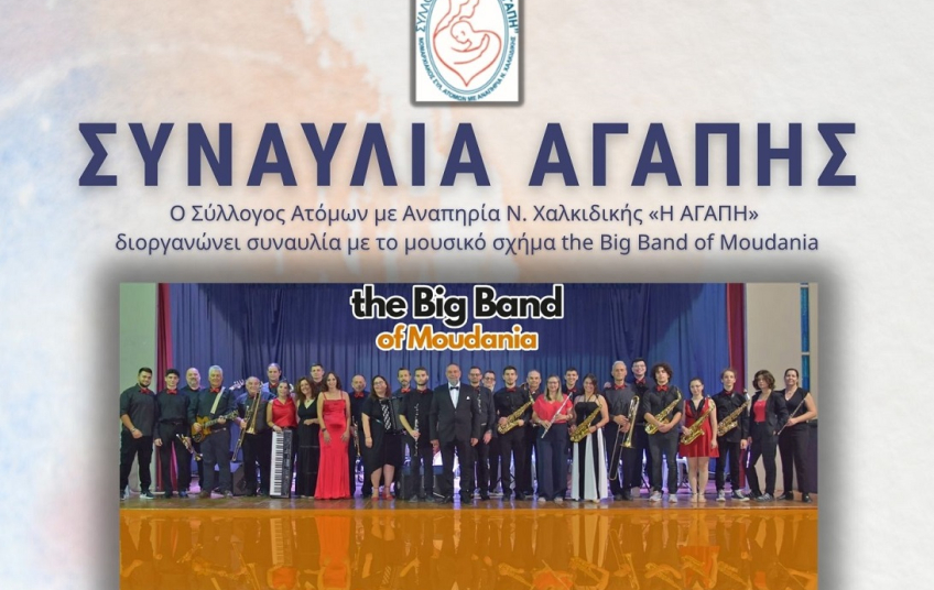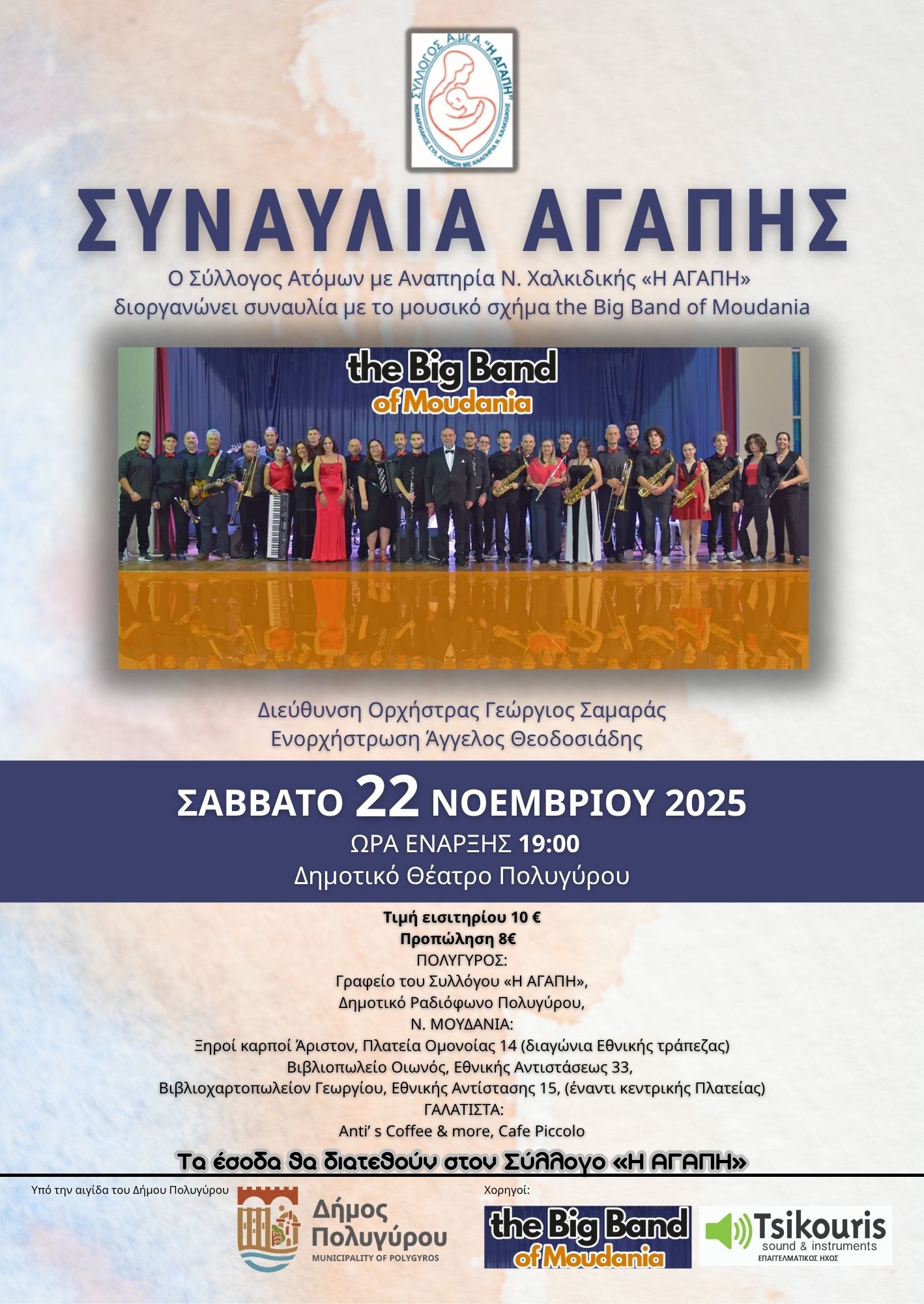 Ο Σύλλογος Ατόμων με Αναπηρία Ν. Χαλκιδικής « Η ΑΓΑΠΗ », διοργανώνει ΣΥΝΑΥΛΙΑ ΑΓΑΠΗΣ με το μουσικό σχήμα "the Big Band of Moudania", το Σάββατο 22 Νοεμβρίου 2025, στις 19:00, στο Δημοτικό Θέατρο Πολυγύρου, υπό την αιγίδα του Δήμου Πολυγύρου.