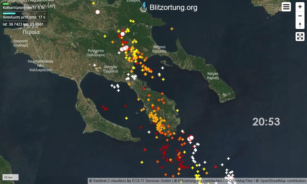 Εντυπωσιακό, αλλά και ανησυχητικό, είναι το σκηνικό στους ουρανούς της Σιθωνίας και του κόλπου του Αγίου Όρους, όπου παρατηρούνται συνεχείς κεραυνοί.