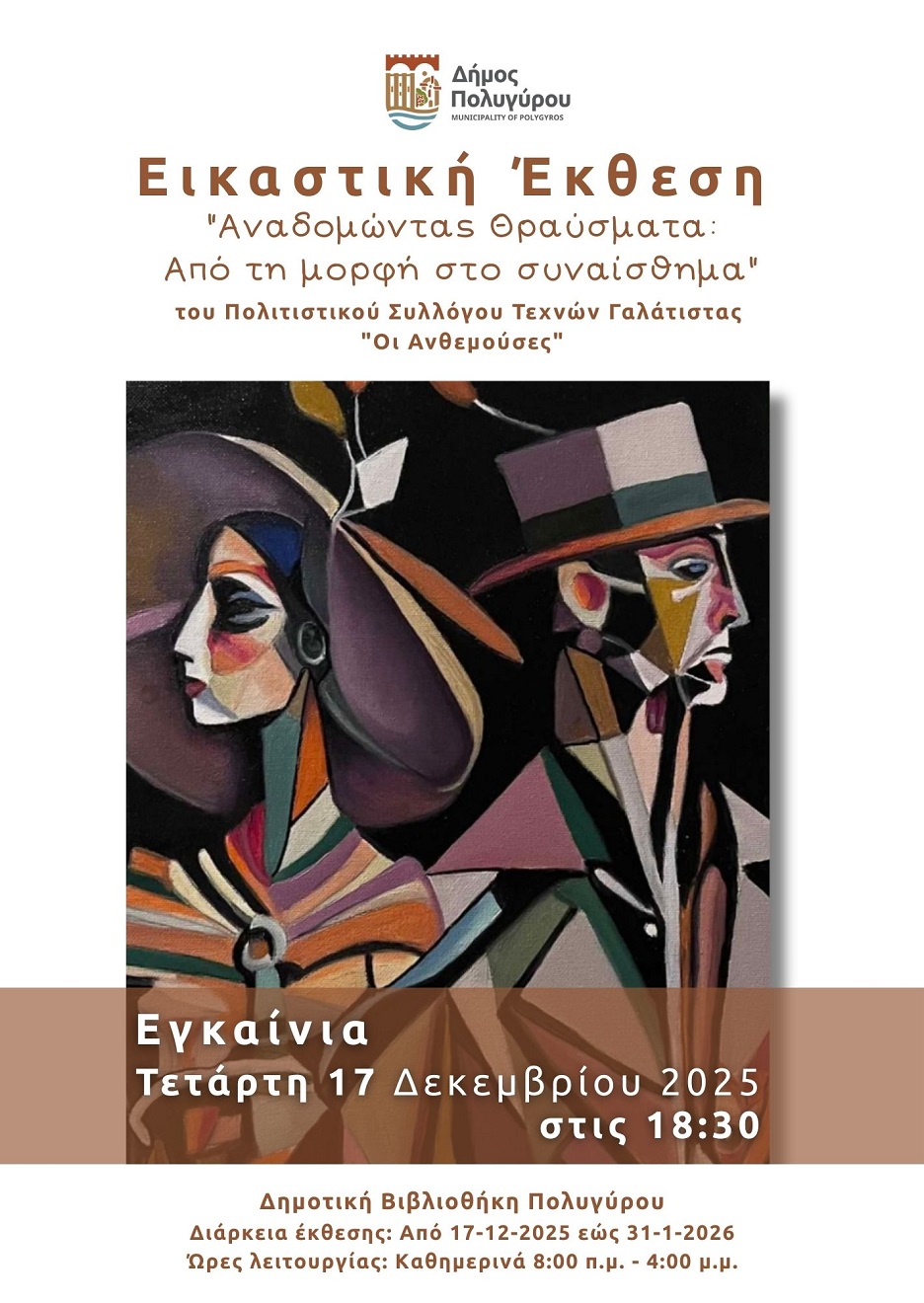 Σε γιορτινό κλίμα Χριστουγέννων, η Δημοτική Βιβλιοθήκη Πολυγύρου φιλοξενεί την εικαστική έκθεση του Πολιτιστικού Συλλόγου Τεχνών Γαλάτιστας «Οι Ανθεμούσες», με τίτλο «Αναδομώντας θραύσματα: Από τη μορφή στο συναίσθημα».