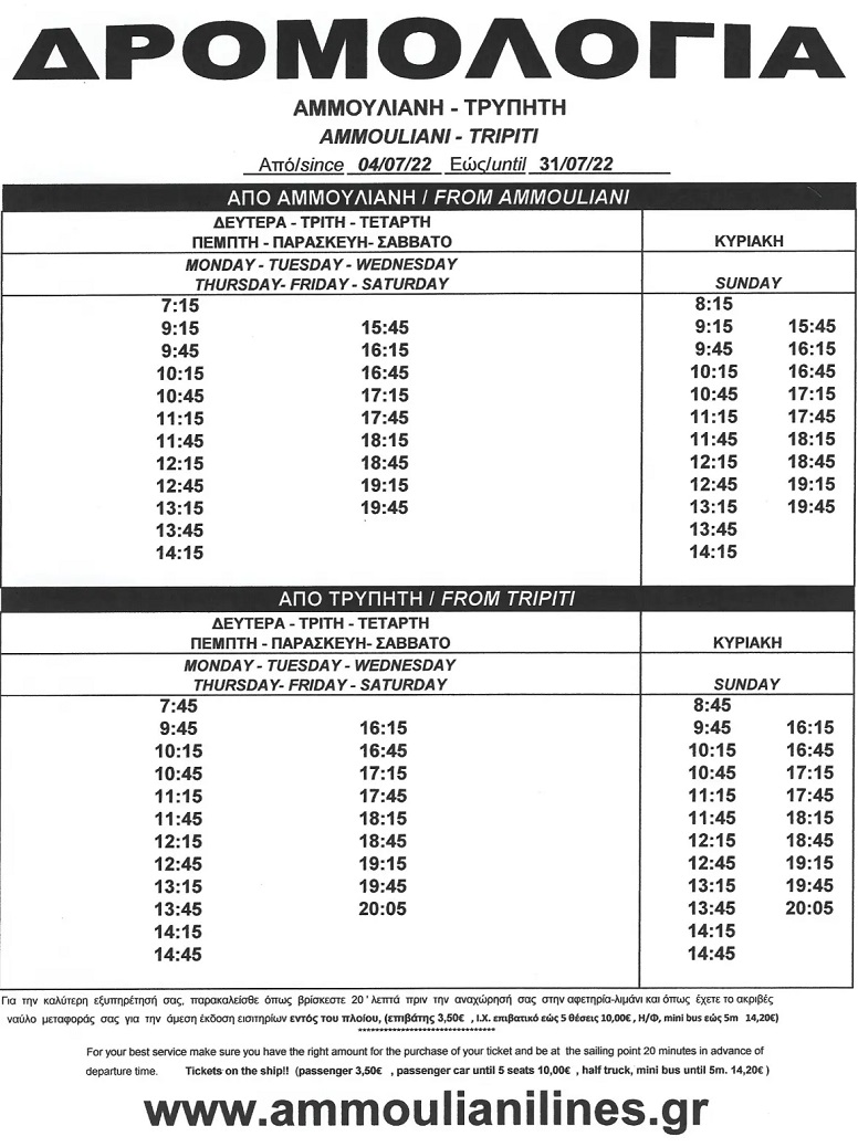 Αυξάνονται τα δρομολόγια του σκάφους «Αμμουλιανή 2003» από και προς το νησί της Αμμουλιανής, καθώς η τουριστική κίνηση είναι ιδιαίτερα αυξημένη. Το σκάφος θα κάνει δρομολόγια το βράδυ μετά το πέρας των τακτικών δρομολογίων των φερυ μποτ.