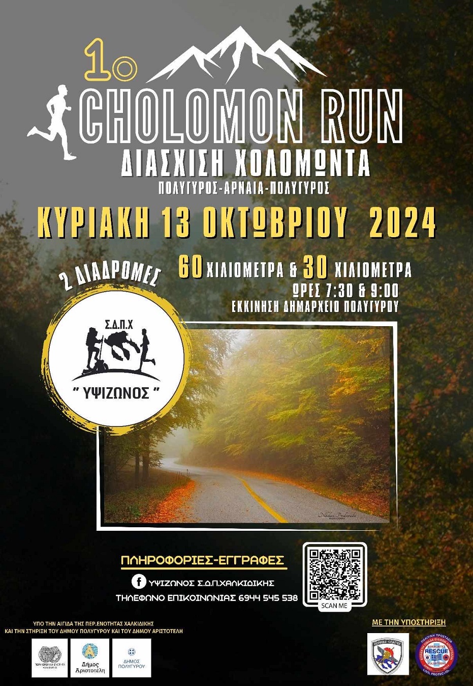 Ο Σύλλογος Δρομέων Περιπατητών Χαλκιδικής "Υψίζωνος" διοργανώνει το 1ο CHOLOMON RUN - διάσχιση Χολομώντα στον Πολύγυρο Χαλκιδικής με 2 ασφάλτινες διαδρομές 30 και 60 χιλιομέτρων.