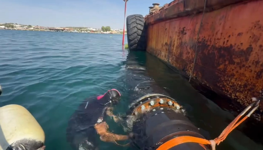 Στις υποβρύχιες λήψεις ξεχωρίζει ο δύτης που επιβλέπει τη διαδικασία τοποθέτησης, σε ένα έργο υψηλών απαιτήσεων και σημαντικής τεχνικής δυσκολίας.