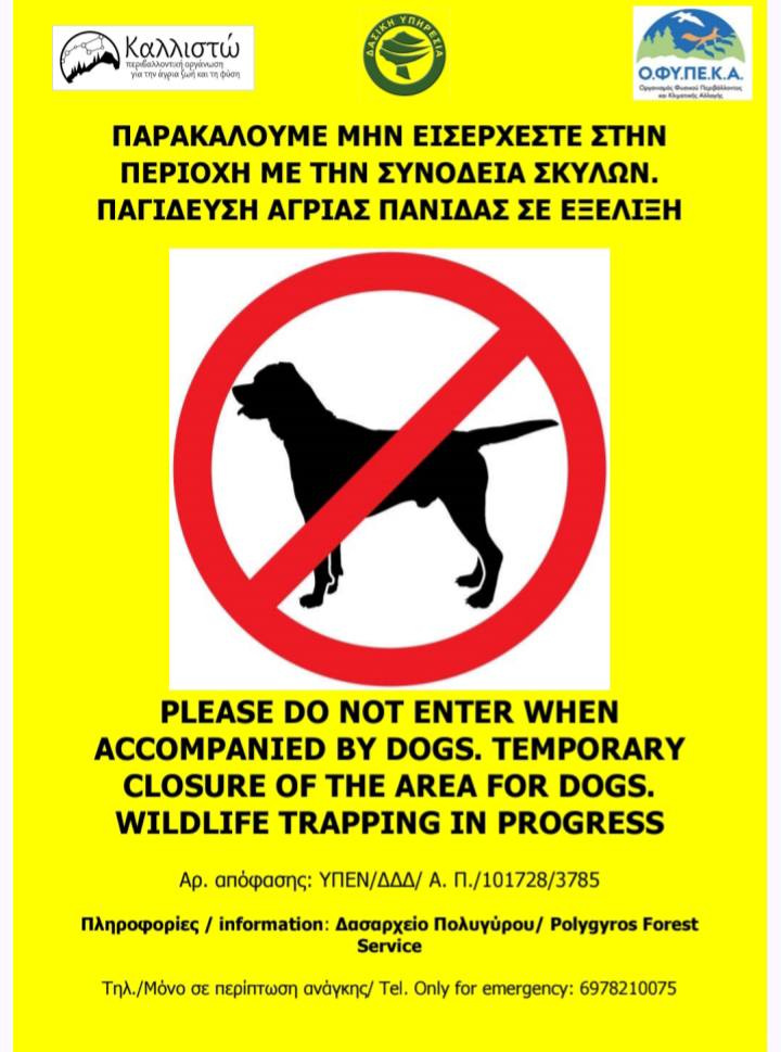 Ενημερωτικές πινακίδες που προειδοποιούν τους πολίτες να μην εισέρχονται συνοδεία σκύλων στα σημεία όπου βρίσκεται σε εξέλιξη επιχείρηση παγίδευσης λύκου, στον Νέο Μαρμαρά Χαλκιδικής τοποθέτησαν οι εμπλεκόμενοι φορείς.