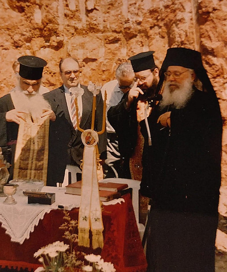 Σε φωτογραφικό στιγμιότυπο της εποχής, ο Μητροπολίτης Κασσανδρείας διακρίνεται με τον Γέροντα Αγαθάγγελο κατά την ημέρα της Θεμελίωσης του Ιερού Ναού (30 Ιουνίου 1996) – μια ιστορική και ιεροπρεπής στιγμή για την πόλη του Πολυγύρου.