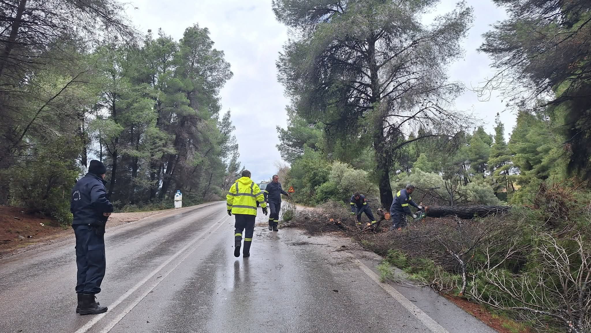 Στην επαρχιακή οδό Σιθωνίας οι ισχυροί άνεμοι έχουν ξεριζώσει πεύκα. Ένα δέντρο έπεσε μεταξύ Νικητής και Μεταμόρφωσης και ένα μεταξύ Μεταμόρφωσης - Βατοπεδίου. Στο σημείο βρίσκονται μέλη της ομάδας Δασοπροστασίας Μεταμόρφωσης.