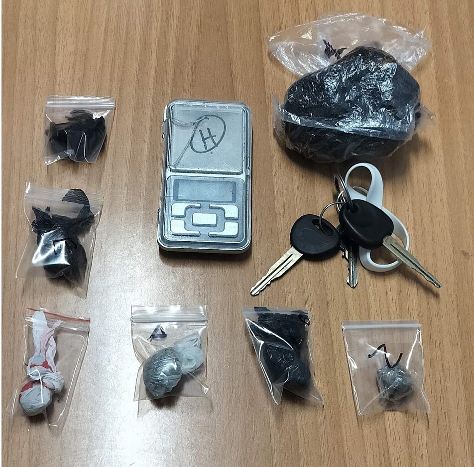 Κατά τη διάρκεια ελέγχου στο όχημα που οδηγούσε, οι αστυνομικοί εντόπισαν και κατέσχεσαν τρεις συσκευασίες με ακατέργαστη κάνναβη συνολικού βάρους 7,6 γραμμαρίων. Σε έρευνα που ακολούθησε στην οικία του, βρέθηκαν επιπλέον τρεις συσκευασίες ακατέργαστης κάνναβης βάρους 42,1 γραμμαρίων, μία συσκευασία κατεργασμένης κάνναβης τύπου «σοκολάτα» βάρους 4,6 γραμμαρίων, καθώς και μία ηλεκτρονική ζυγαριά ακριβείας.