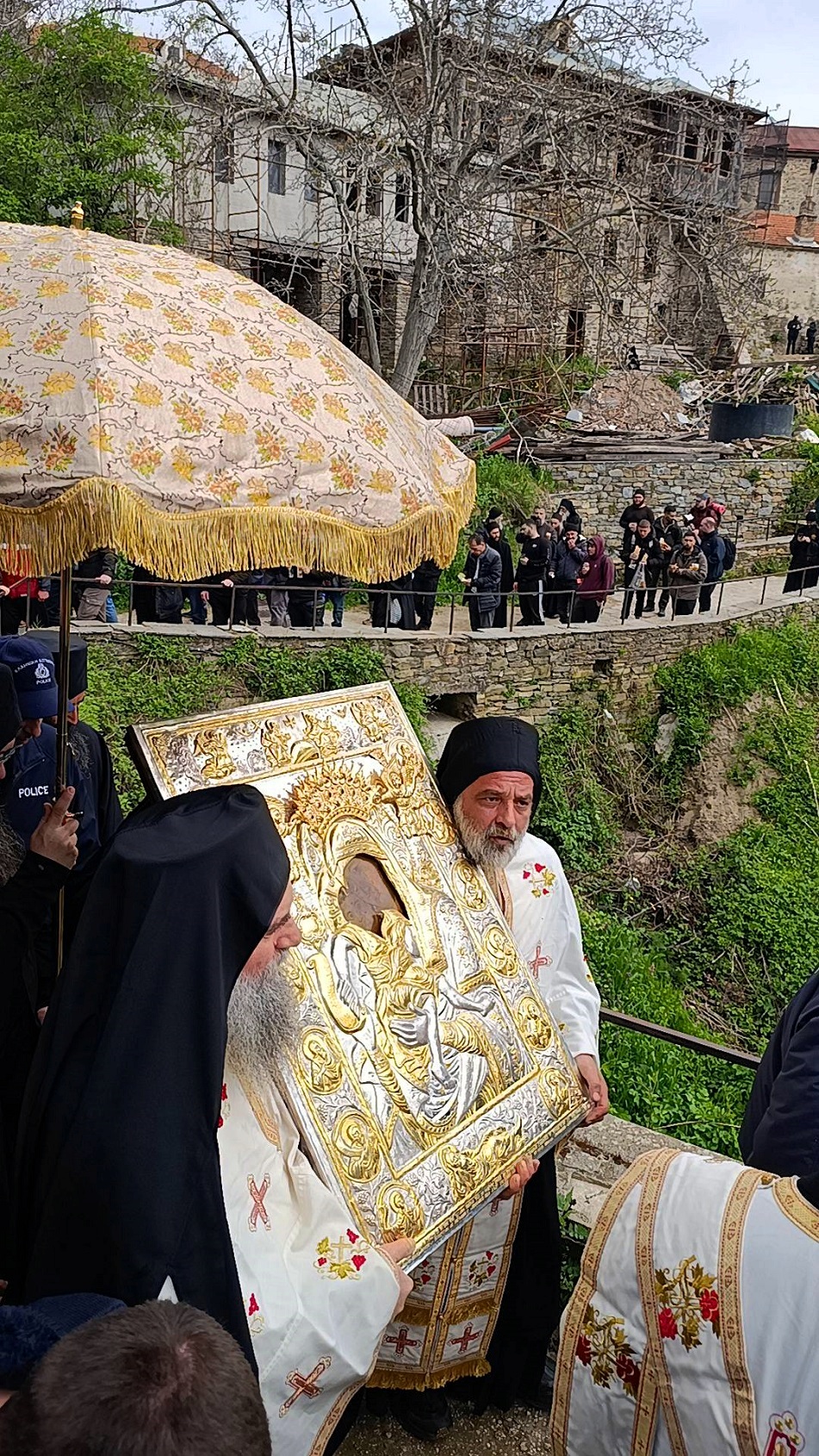 Η λιτανεία ξεκίνησε από τον Ιερό Ναό του Πρωτάτου, αμέσως μετά τη Θεία Λειτουργία, μέσα σε κλίμα κατάνυξης και επισημότητας, με ήχους από καμπάνες και βυζαντινές ψαλμωδίες των πατέρων.