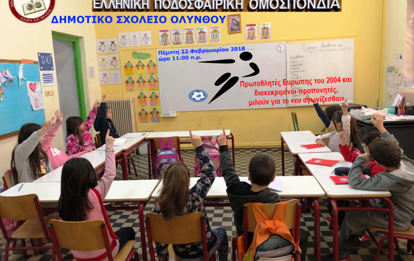 Το πρόγραμμα θα υλοποιηθεί στο Δημοτικό Σχολείο Ολύνθου την Πέμπτη 22-02-2018 στις 11:00 π.μ. στον αύλειο χώρο. Στο πλαίσιο του προγράμματος θα φιλοξενηθούν Πρωταθλητές Ευρώπης του 2004 και διακεκριμένοι προπονητές, για να μιλήσουν στα παιδιά για το «ευ αγωνίζεσθαι» και τις άλλες ευγενείς αξίες του ποδοσφαίρου.