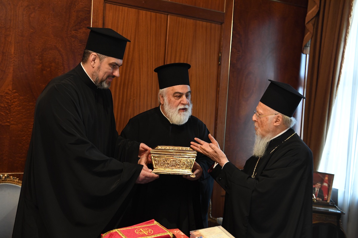 Ένα ικανό απότμημα του Ιερού Λειψάνου της Αγίας Αναστασίας της Φαρμακολυτρίας προσέφεραν στον Οικουμενικό Πατριάρχη Βαρθολομαίο οι κληρικοί π.Μπογκτάν Γουλιάμωφ και π.Πέτρος Ζούγιεφ, της Αυτοκεφάλου Εκκλησίας της Ουκρανίας, κατά την συνάντησή που είχαν σήμερα, Τετάρτη, 10 Απριλίου, στο Φανάρι.