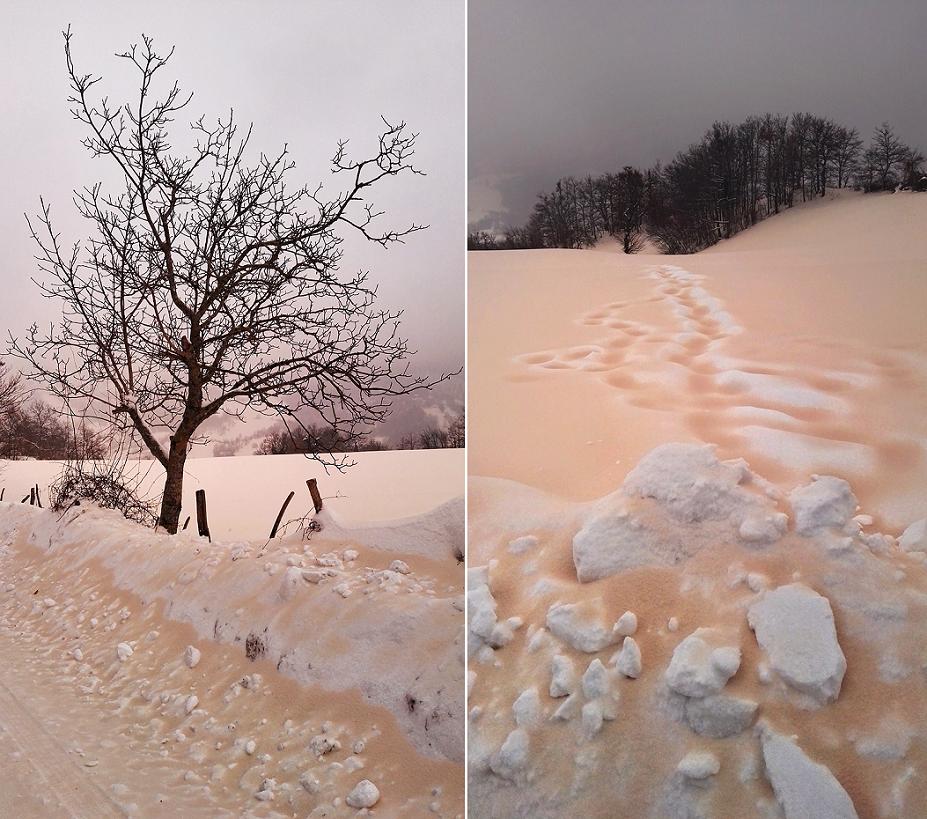 Είναι χιόνι με ροζ απόχρωση που έχει καλύψει το δάσος και οι φωτογραφίες τραβήχτηκαν από τον 35χρονο Tommaso D'Errico στην Ιταλία στα Απέννινα Όρη. Το εντυπωσιακό αυτό θέαμα φέρεται να προκλήθηκε καθώς η μεταφορά σκόνης από την Αφρική επηρέασε την απόχρωση του χιονιού πέφτοντας μαζί του στο έδαφος.