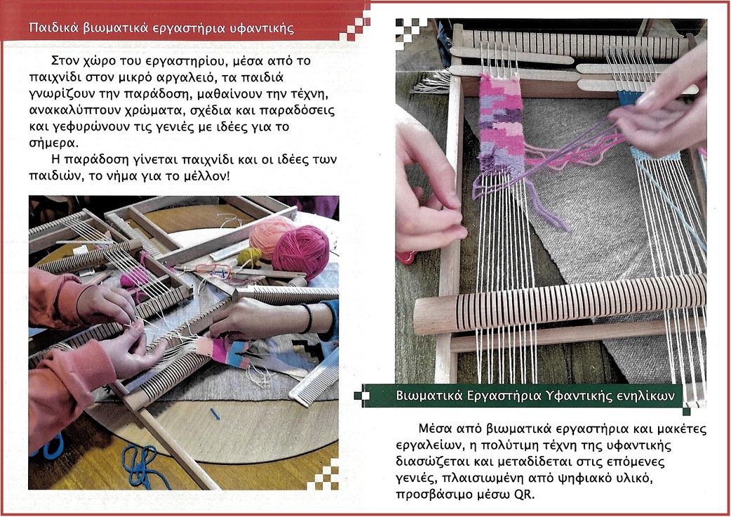 Στο επίκεντρο του φυλλαδίου βρίσκεται το Εργαστήρι Υφαντικής, ένας ειδικά διαμορφωμένος χώρος όπου μικροί και μεγάλοι έρχονται σε επαφή με την αυθεντική και παραδοσιακή υφαντική τέχνη.
