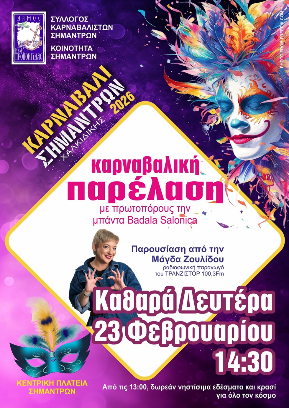Το τετραήμερο πρόγραμμα του Καρναβαλιού Σημάντρων, ενός θεσμού με ιστορία άνω των 50 ετών, παρουσιάστηκε σήμερα σε συνέντευξη Τύπου, δίνοντας το έναυσμα για τις φετινές αποκριάτικες εκδηλώσεις που θα πραγματοποιηθούν από 20 έως 23 Φεβρουαρίου.