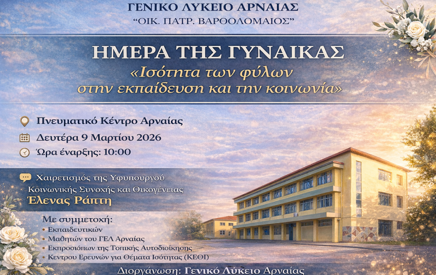 Εκδήλωση αφιερωμένη στην Ημέρα της Γυναίκας με θέμα «Ισότητα των φύλων στην εκπαίδευση και την κοινωνία» διοργανώνει το Γενικό Λύκειο Αρναίας “Οικ. Πατρ. Βαρθολομαίος”, τη Δευτέρα 9 Μαρτίου 2026 στο Πνευματικό Κέντρο Αρναίας.