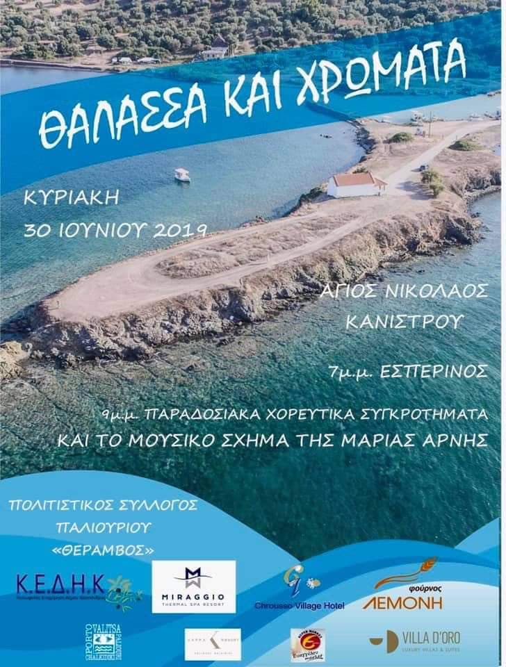 Ο Πολιτιστικός Σύλλογος Παλιουρίου «Θέραμβος» διοργανώνει την εκδήλωση «Θάλασσα και Χρώματα» που θα πραγματοποιηθεί την Κυριακή 30 Ιουνίου και ώρα 19:00 στην περιοχή Κάνιστρο Παλιουρίου (ακρωτήρι Αγίου Νικολάου).