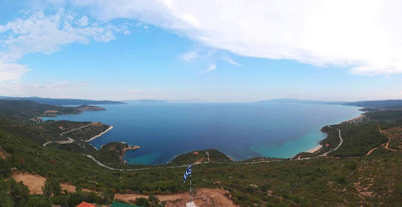 Αριστερά η ματιά αγκαλιάζει τα Πυργαδίκια, το ακρωτήρι ¨Αρκούδα¨ και στη συνέχεια την χερσόνησο του Αγίου Όρους με τη γρανιτένια και σχεδόν μόνιμα χιονισμένη κορυφή του Άθωνα να ξεπροβάλει απότομα μέσ' απ' τη θάλασσα. Δεξιά απλώνεται η ακτή Σαλονικιού, ο Όρμος Παναγίας, το ειδυλλιακό νησιώτικο σύμπλεγμα της Βουρβουρούς κι η ορεινή γραμμή της ανατολικής πλευράς της Σιθωνίας που σβήνει απαλά στις ακτές της Συκιάς.