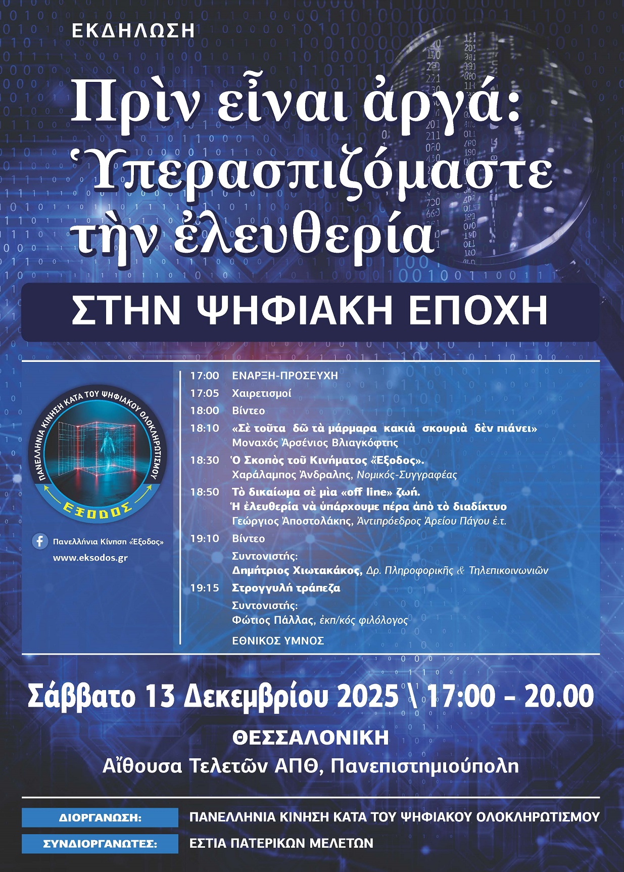 Μια ιδιαίτερα επίκαιρη και πολυσυζητημένη εκδήλωση με τίτλο «Πριν είναι αργά: Υπερασπιζόμαστε την ελευθερία στην ψηφιακή εποχή» διοργανώνει η Πανελλήνια Κίνηση κατά του Ψηφιακού Ολοκληρωτισμού “Έξοδος”, το Σάββατο 13 Δεκεμβρίου 2025, από τις 17:00 έως τις 20:00, στην Αίθουσα Τελετών του ΑΠΘ, στην Πανεπιστημιούπολη Θεσσαλονίκης. Συμπαραστάτης στη διοργάνωση είναι η Εστία Πατερικών Μελετών.