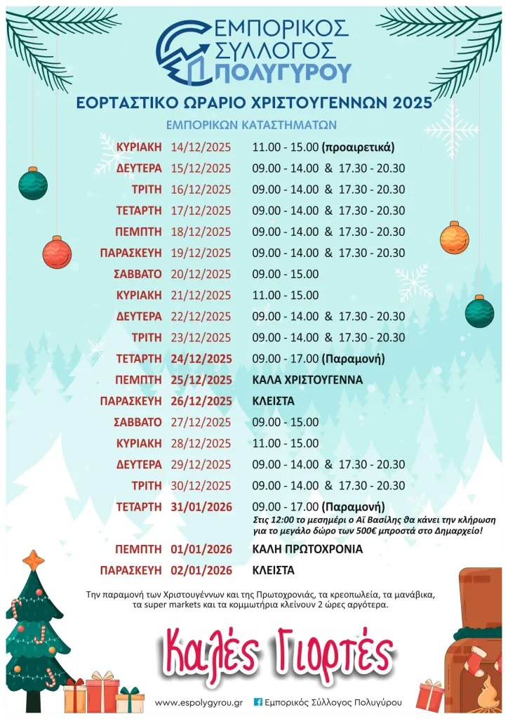 Ο Εμπορικός Σύλλογος Πολυγύρου ανακοίνωσε το εορταστικό ωράριο λειτουργίας των εμπορικών καταστημάτων για την περίοδο των Χριστουγέννων και της Πρωτοχρονιάς 2025. Το πρόγραμμα καλύπτει την περίοδο από 14 Δεκεμβρίου 2025 έως και 2 Ιανουαρίου 2026, με διευρυμένα ωράρια τις περισσότερες ημέρες, ώστε να διευκολυνθούν οι καταναλωτές στις εορταστικές αγορές τους.
