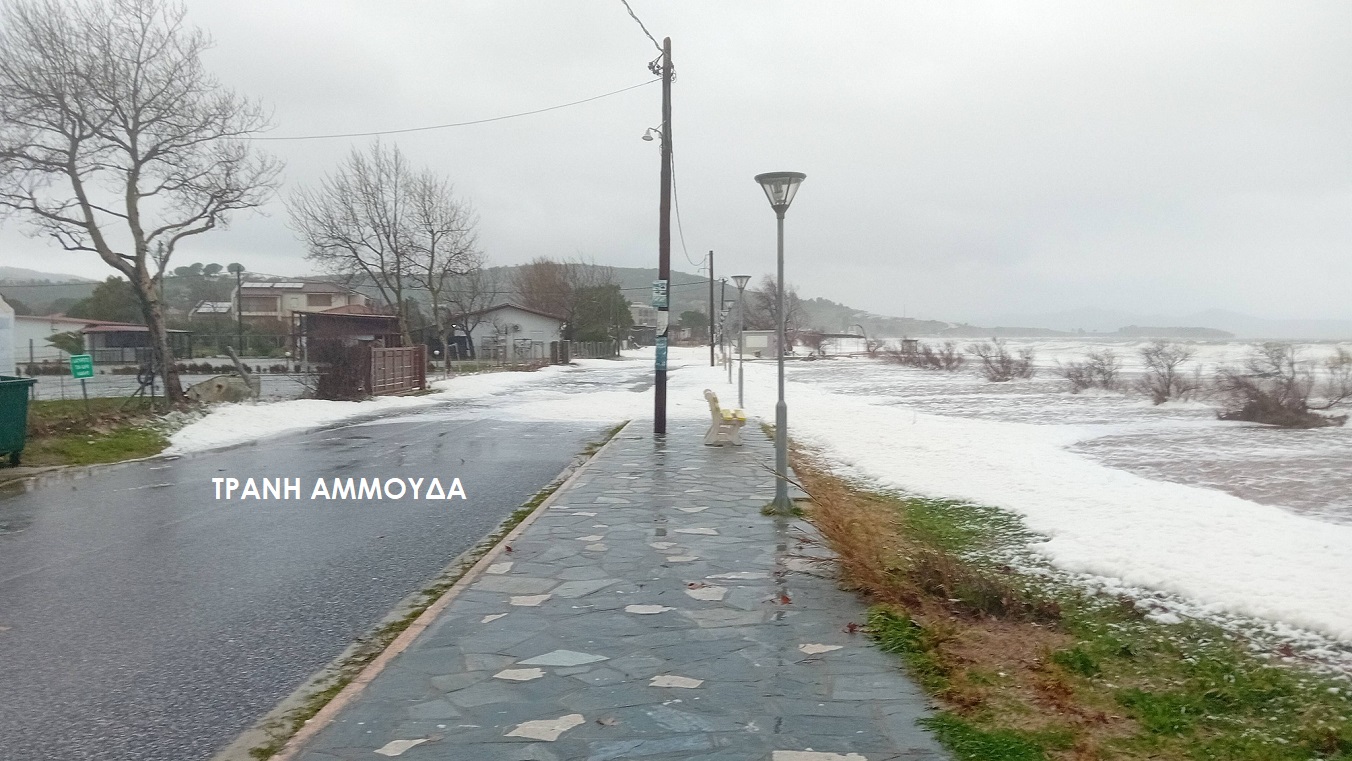 Ένα εντυπωσιακό και ασυνήθιστο θέαμα αντίκρισαν κάτοικοι και επισκέπτες στον Όρμο Παναγίας, καθώς λόγω των ισχυρών ανέμων η θάλασσα «σκέπασε» τμήματα της παραλίας με πυκνό λευκό αφρό.