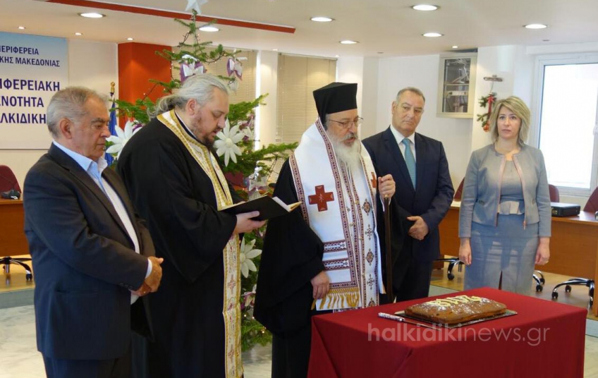 Μετά το πέρας της Δοξολογίας, πραγματοποιήθηκε η καθιερωμένη κοπή της πρωτοχρονιάτικης πίτας στο Διοικητήριο της Περιφερειακής Ενότητας Χαλκιδικής.